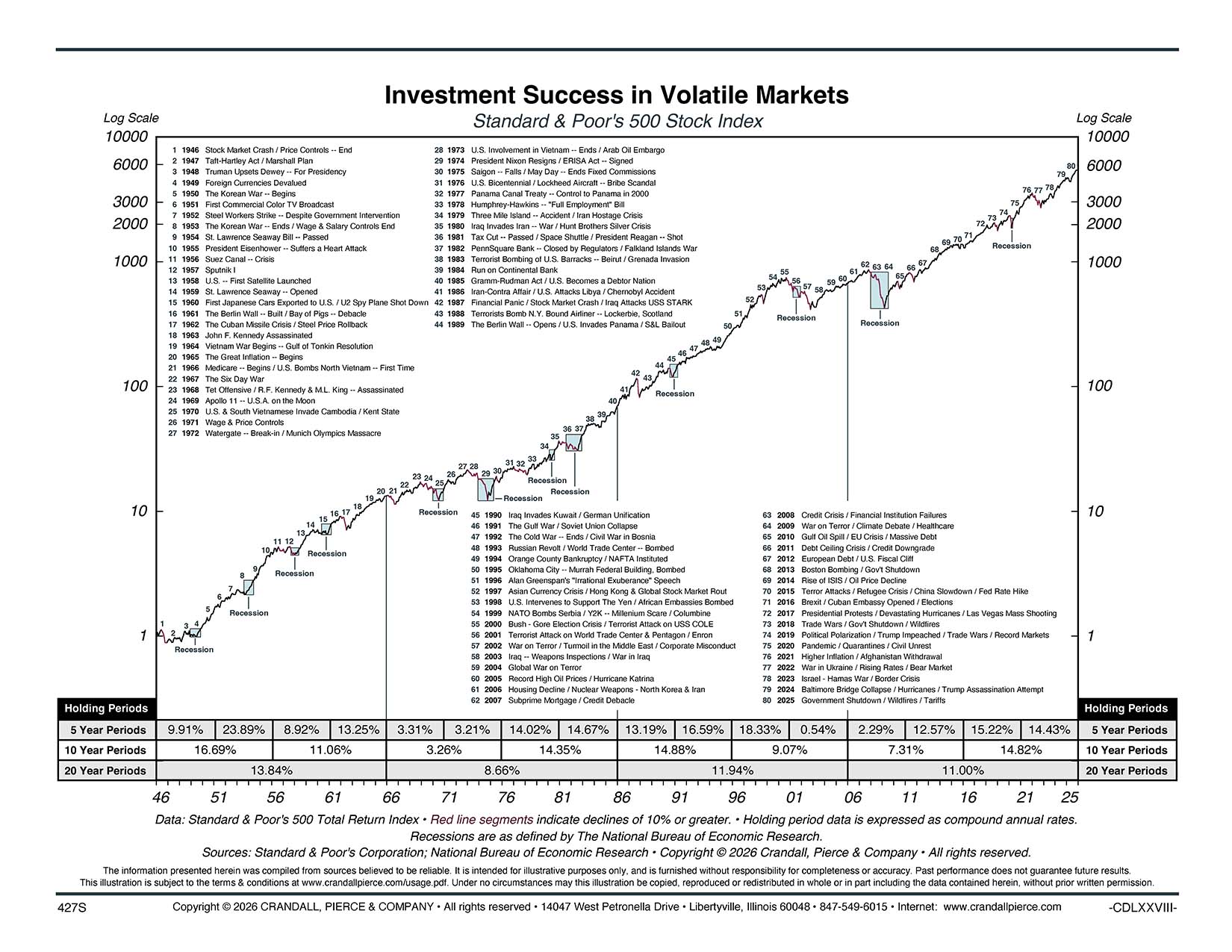 This is a chart of the S&P 500 going back to the late 1940s. Every event that made people want to sell is labeled on it. The Korean War. The Cuban Missile Crisis. Vietnam. Watergate. The oil embargo. Black Monday. The Gulf War. September 11th. The financial crisis. COVID. And now, Iran.