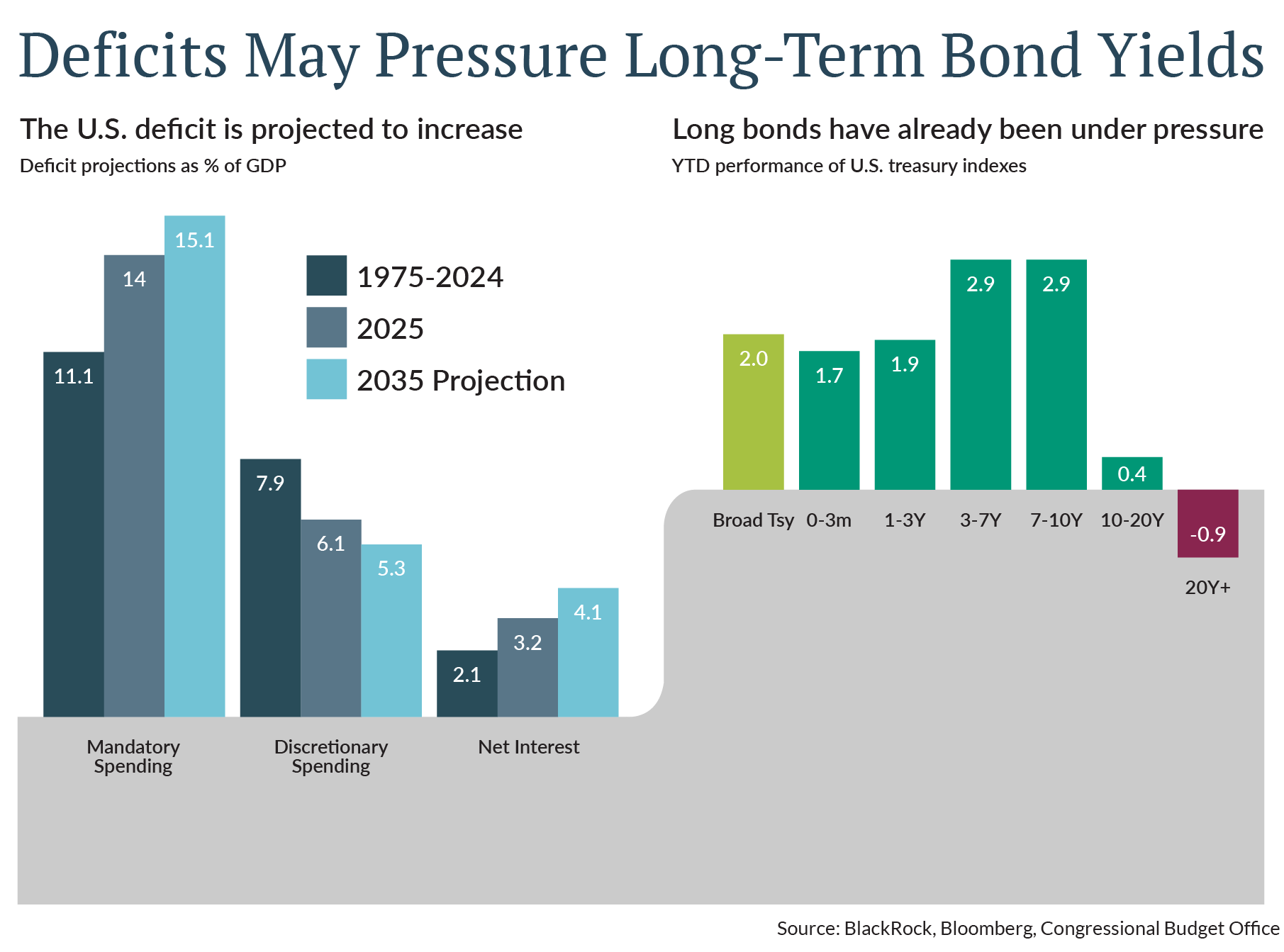 Still, we don’t dismiss deficits and the debt, and the impact they can have on the economy. The left half of the chart below illustrates the difficulty of cutting government spending, as mandatory spending (including popular programs like Social Security, Medicare, and Medicaid) represents about 65% of the budget, and is the largest (and growing) contributor to the deficit. If continued deficit spending results in greater issuance of Treasuries to fund the government, that could increase upward pressure on long-term yields.