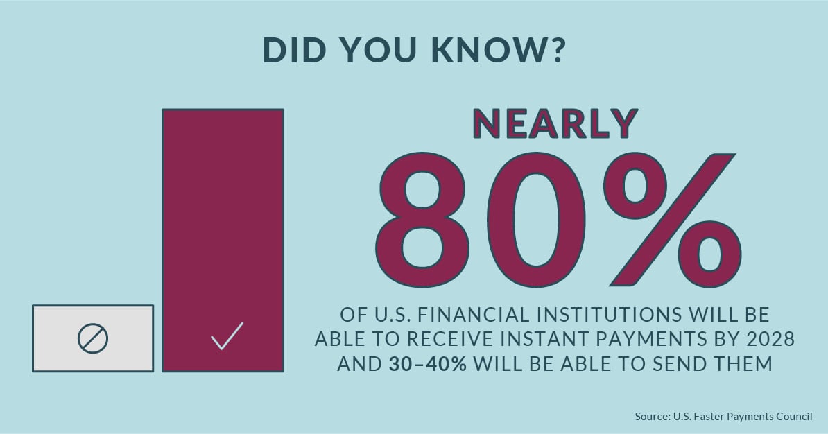 While business adoption has been more measured due to irrevocability concerns and heightened fraud risks, we’re beginning to see businesses receive instant payments, also known as real-time payments, in select B2B scenarios. As more financial institutions adopt these sending capabilities, B2B adoption will begin to scale naturally. In fact, by 2028, 70–80% of U.S. financial institutions will be able to receive instant payments and 30–40% will be able to send them, according to the U.S. Faster Payments Council. This acceleration marks one of the most significant shifts in modern payments since the rise of ACH.