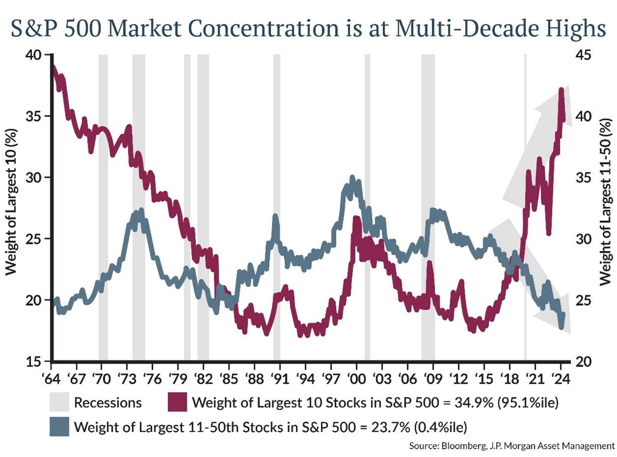 ETFs have become increasingly more mainstream over the past decade, now making up over 32% of the market compared to mutual funds at 68%. Tax efficiency and lower costs are some of the main drivers into what make this vehicle attractive. We must use caution with ETFs, however, as indexes can change relatively quickly. The chart below illustrates the concentration of the top 10 stocks of the S&P 500 Index compared to the weight of the bottom 490. Using a mixture of both mutual funds and ETFs can help us to control for risk. Our Investment Research team also monitors active ETFs which are becoming progressively more popular especially in the fixed income space.