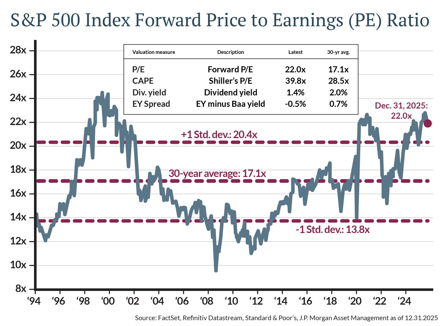 While domestic valuations are high (see figure below showing forward price to earnings ratios), stocks remain a vital component for growth. We are particularly watching for continued strength in AI- related capital spending to support margins. Furthermore, international stocks warrant a meaningful allocation for diversification, having demonstrated leadership in 2025.