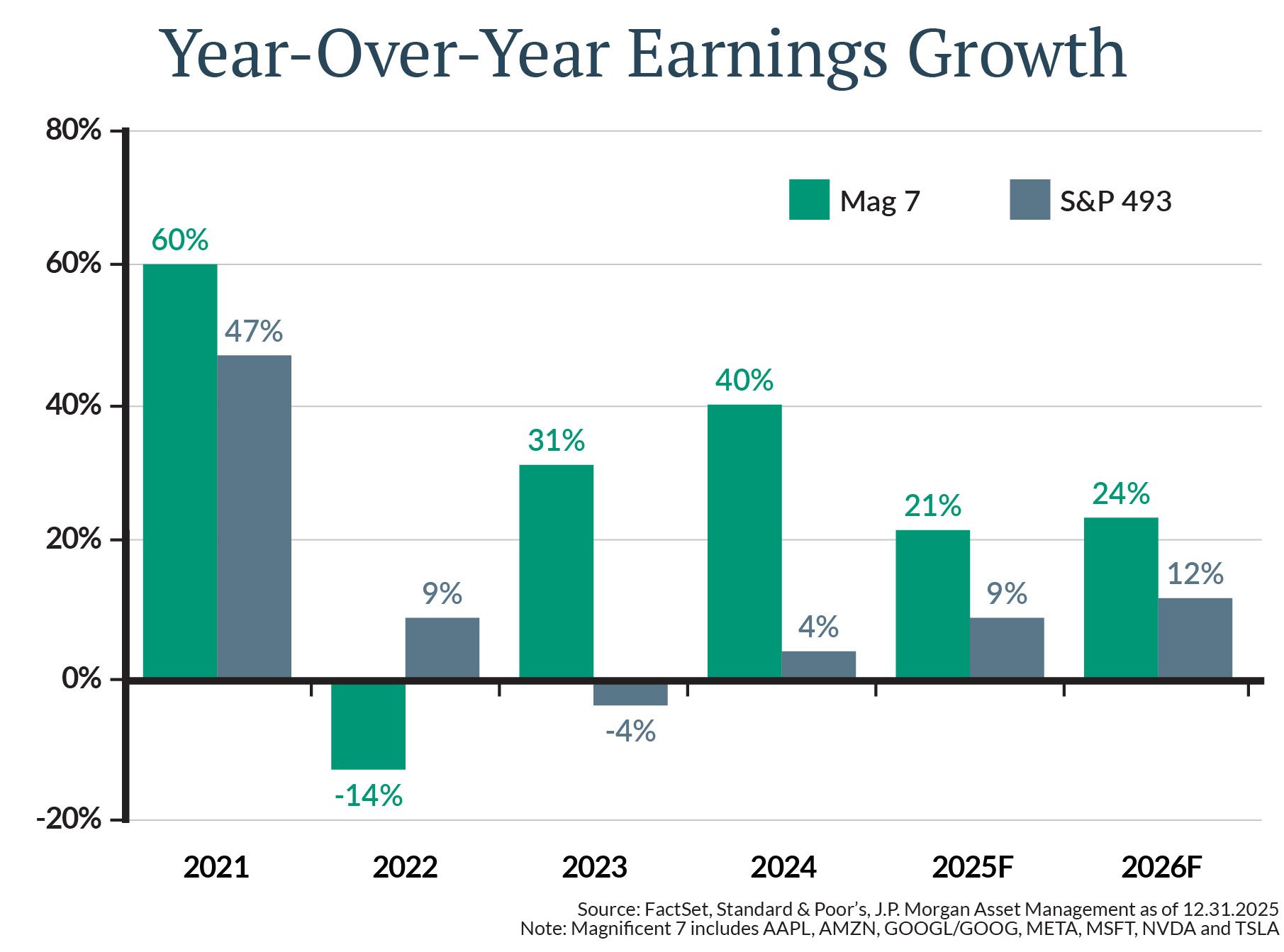 While 2025 saw the Federal Reserve lower rates by three-quarters of a percentage point late in the year—boosting market returns—the outlook for 2026 suggests a distinct shift in drivers. In particular, we expect earnings growth to do the heavy lifting for returns, replacing the multiple expansion seen in previous years.