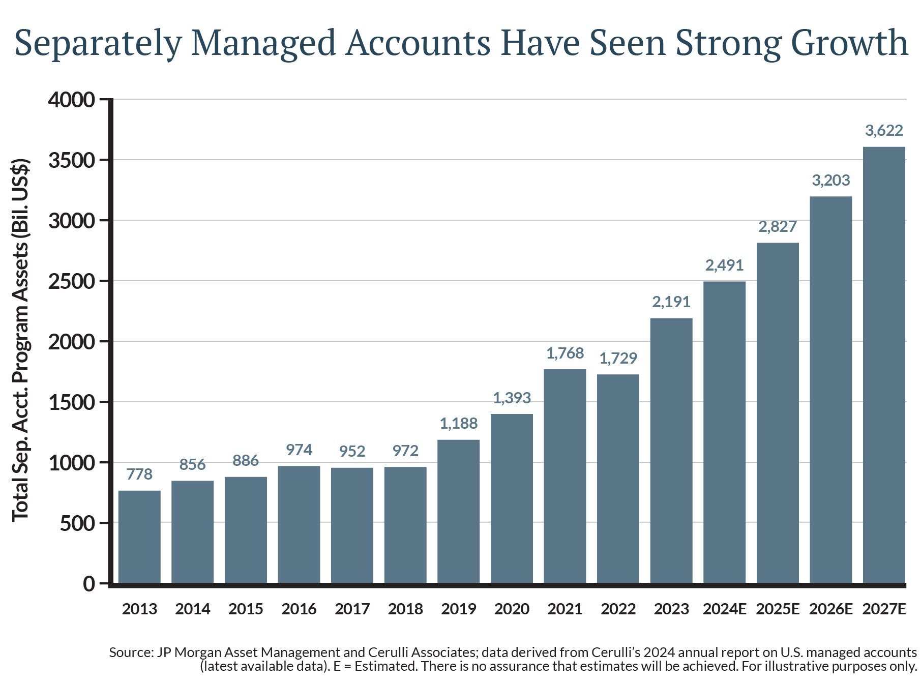 According to research firm Cerulli Associates, assets in separately managed accounts (SMAs) are expected to reach $3.6 trillion in 2026, up from $778 billion in 2013 and $2.2 trillion in 2023 [Figure 1].