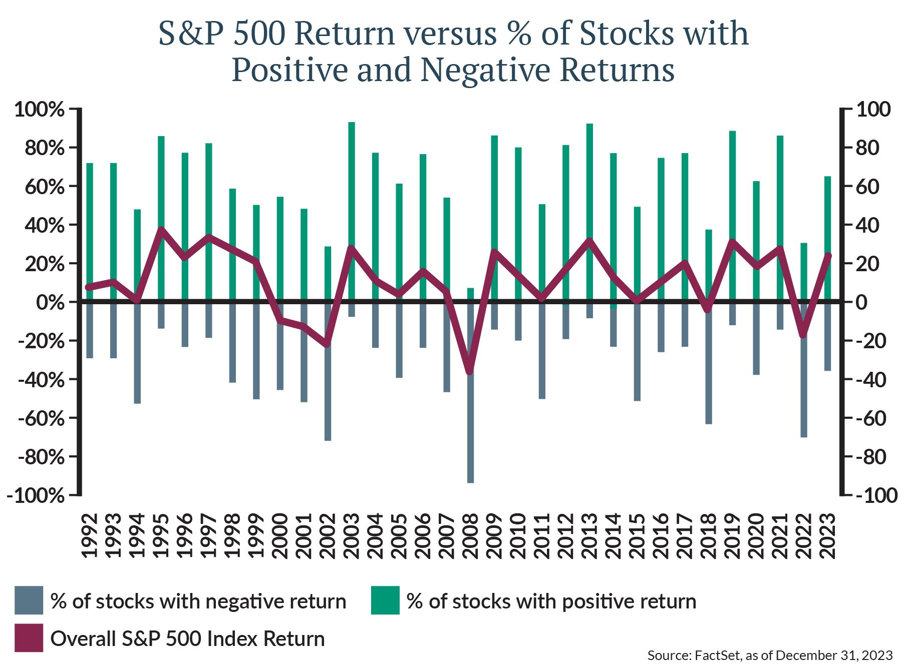 Because personalized indexing investors have direct ownership of the individual stocks in their portfolios, losses can be captured even in a year when the index gains in value. The chart below illustrates that even in the best years for the S&P 500, many individual stocks decline, offering a large opportunity set to harvest losses.